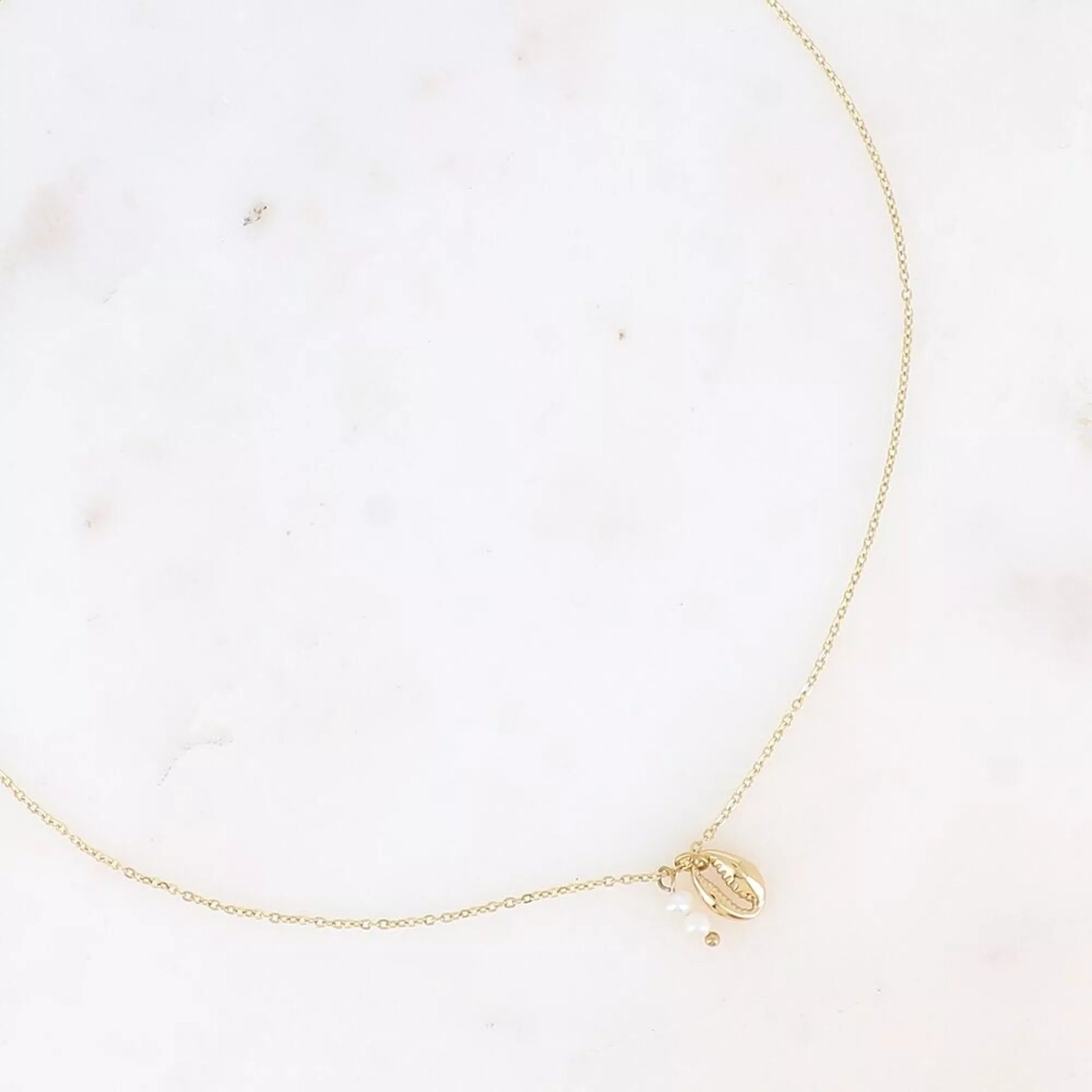 This delicate chain brings sunshine to your neckline β with a golden cowrie shell, two dainty freshwater pearls, and a whisper of ocean breeze. It's your daily dose of coastal calm wrapped in effortless style.