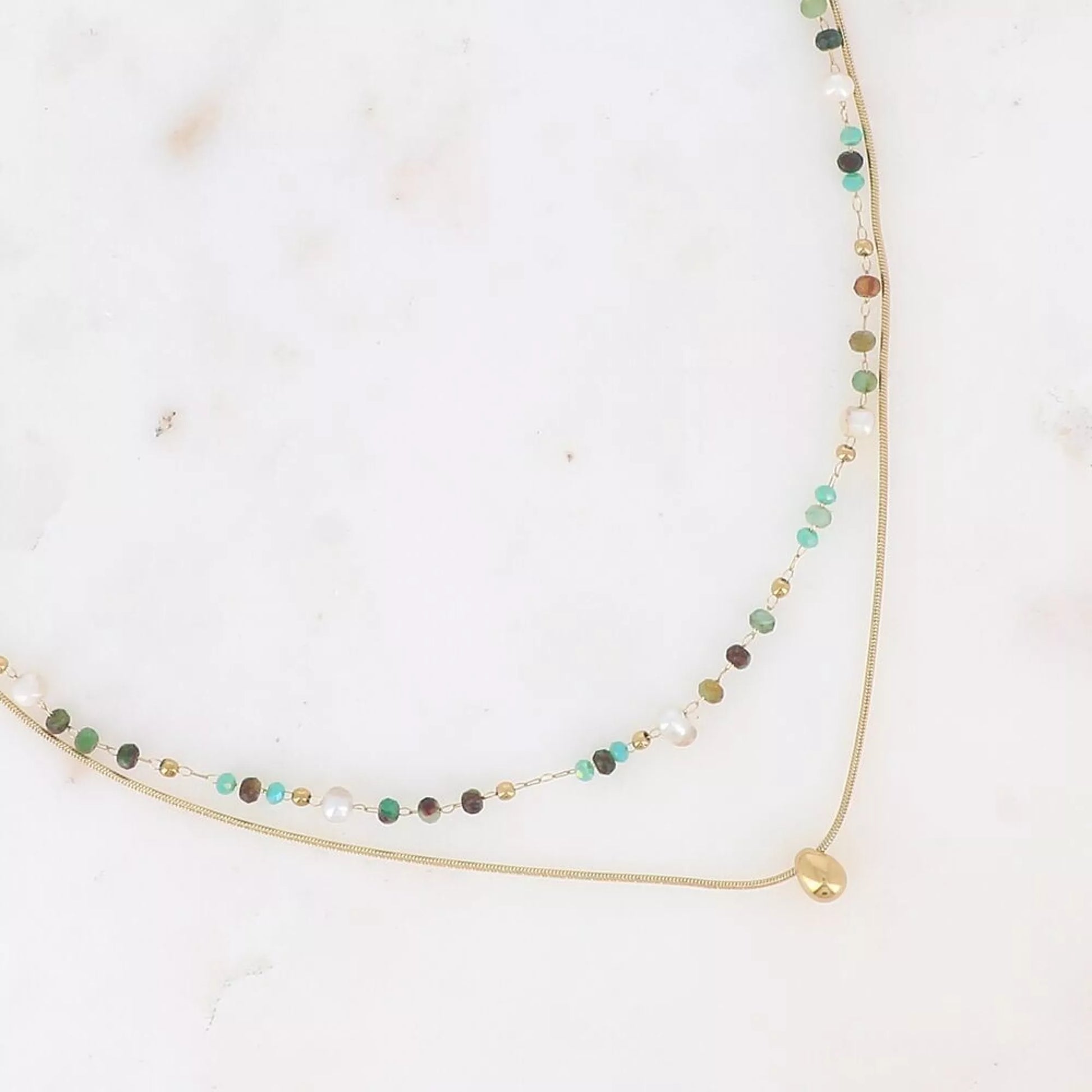 Double the chains, double the charm – this two-row necklace pairs a sleek golden snake chain with a dreamy strand of natural stones, freshwater pearls, and shimmering glass beads. It's giving barefoot luxury with a side of wanderlust.